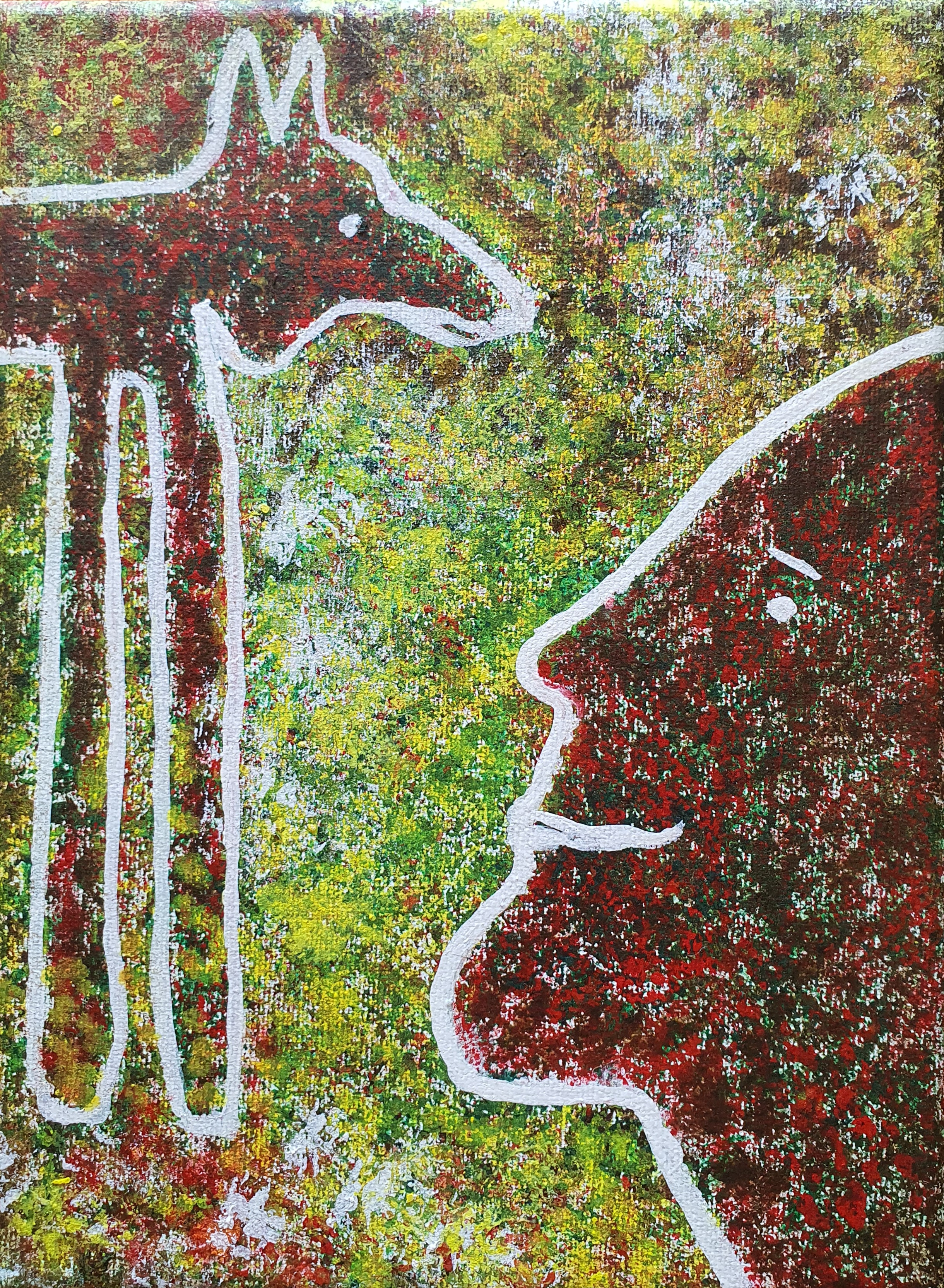Monotype, egg tempera, collage, acrylic are used in the flat surface. These are sometimes combined into mixed media work. Or they are further developed into digital work using a smartphone or computer. And then printed on watercolor paper, canvas, aluminum or plexiglass.